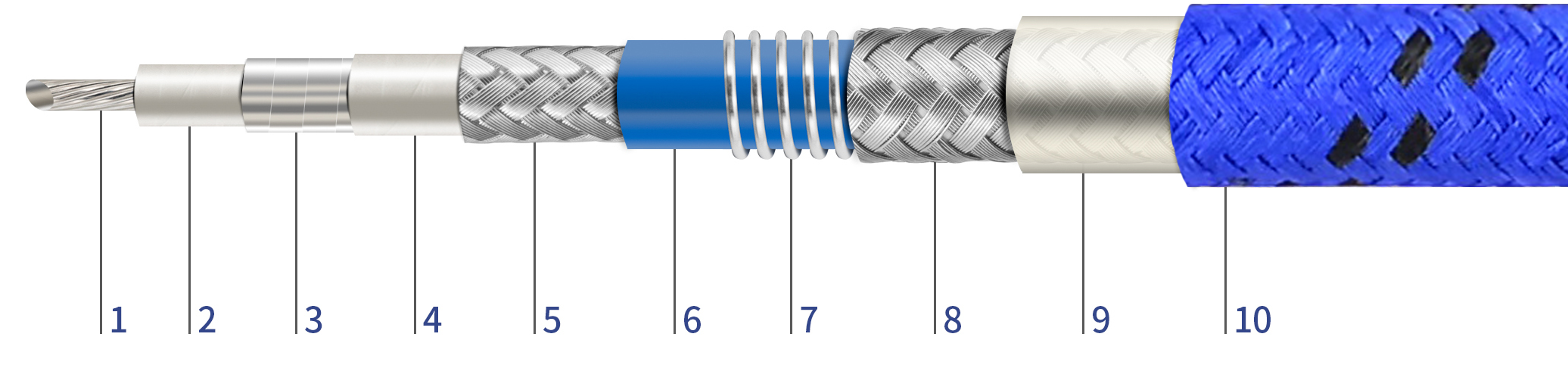 1.中心導(dao)體/銅鍍(dù)銀(單芯(xin)或多芯(xīn)) 2.介質層(céng)/低密度(dù)PTFE 3.内層屏(ping)蔽/鍍銀(yin)銅帶繞(rao)包 4.中間(jian)層/PTFE包覆(fù) 5.外編織(zhi)層/鍍銀(yín)銅絲 6.外(wai)護套/藍(lan)色FEP 7.彈簧(huáng)結構/不(bu)鏽鋼絲(si) 8.外編織(zhi)層/鍍銀(yin)銅絲 9.防(fang)水層/聚(ju)酰亞胺(an)+PTFE 10.外護套(tao)/藍色PTFE絲(sī) |