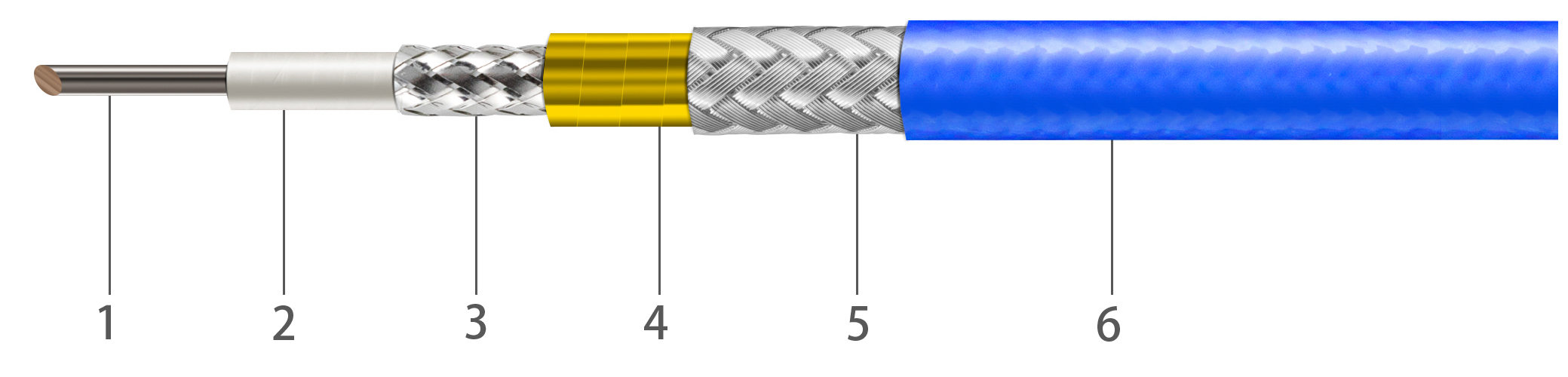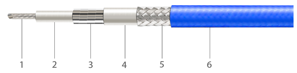 1.中心(xīn)導體/銅(tong)鍍銀(單(dan)芯或多(duo)芯) 2.介質(zhì)層/低密(mi)度PTFE 3.内層(ceng)屏蔽/鍍(dù)銀銅帶(dai)繞包 4.中(zhong)間層/PTFE包(bao)覆 5.外編(biān)織層/鍍(du)銀銅絲(si) 6.外護套(tào)/藍色FEP |