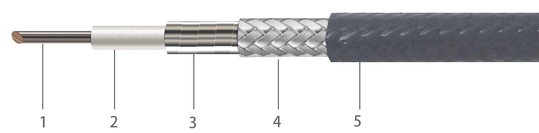 1.中(zhōng)心導體(tǐ)/銅鍍銀(yin)(單芯) 2.介(jiè)質層/低(di)密度PTFE 3.内(nèi)層屏蔽(bi)/鍍銀銅(tóng)帶繞包(bāo) 4.外編織(zhi)層/鍍銀(yin)銅絲 5.外(wai)護套/灰(hui)色PFA |