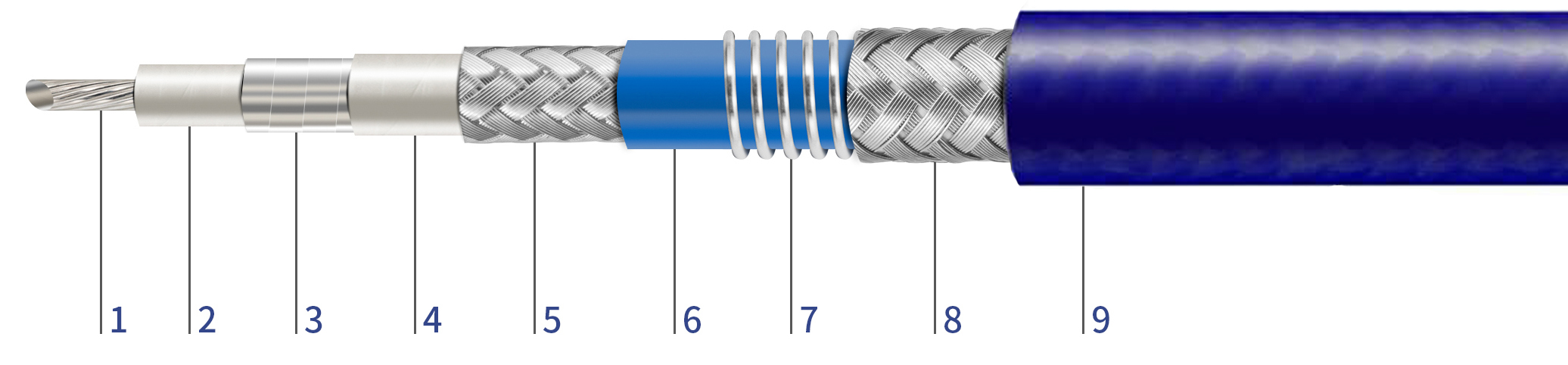 1.中心導(dǎo)體/銅鍍(du)銀(單芯(xīn)或多芯(xīn)) 2.介質層(ceng)/低密度(du)PTFE 3.内層屏(ping)蔽/鍍銀(yín)銅帶繞(rào)包 4.中間(jiān)層/PTFE包覆(fù) 5.外編織(zhī)層/鍍銀(yin)銅絲 6.外(wai)護套/藍(lan)色FEP 7.彈簧(huang)結構/不(bu)鏽鋼絲(si) 8.外編織(zhi)層/鍍銀(yin)銅絲 9.外(wài)護套/藍(lan)色PUR |
